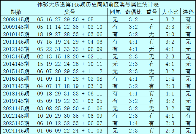 体彩大乐透第145期历史同期开出16次奖号,其统计详见下表: