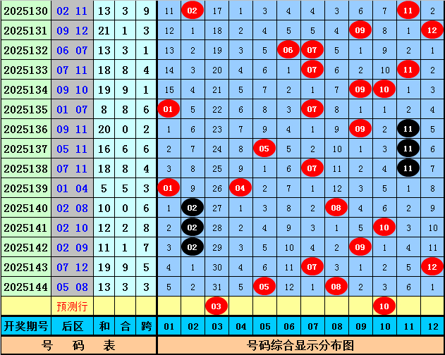 后区号码分析:在第145期历史同期开奖中奖,奖号06出现7次,奖号03出现6次,奖号11出现5次,奖号10出现3次,奖号01 05 09出现2次,奖号02 04 07 08 12出现1次。本期后区五码参考02、03、06、08、10。