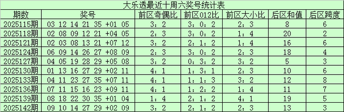 前区奇偶走势:上期前区奇偶比为3:2,上周六前区奇偶比3:2,最近十周六奇数号码表现占优,本期注意偶数号码回补转热,关注奇偶比2:3。
