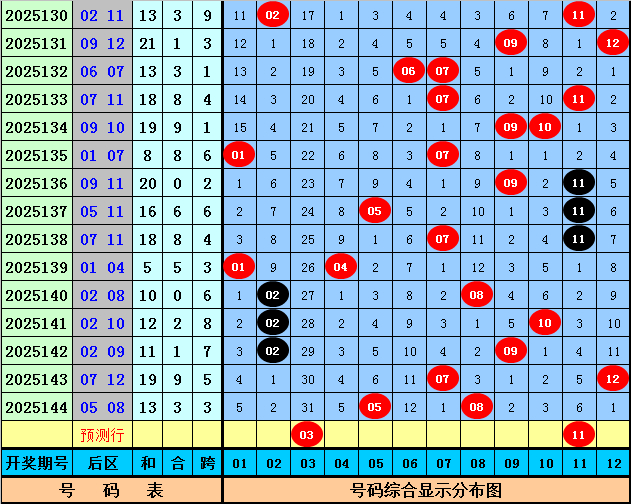 后区分析:上期后区奖号为05+08,开出一大一小组合,上周六后区奖号开出02+09,最近十周六后区奖号大小比为11:9,大小 号码走势基本相当,本周六看好大小 号码继续平衡,关注两码03、11。