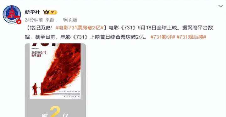 等了四年,电影《731》这回定在九月十八号上,票房一下就冲到两亿,电影院里坐得满满当当,好多人现场就抹眼泪