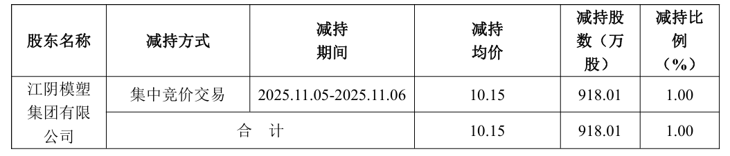 消息面上,近日,模塑科技公告称,公司控股股东江阴模塑集团有限公司(以下简称“模塑集团”)于2025年11月5日至6日通过二级市场集中竞价交易方式减持918.01万股公司股份,占公司总股本的1%。